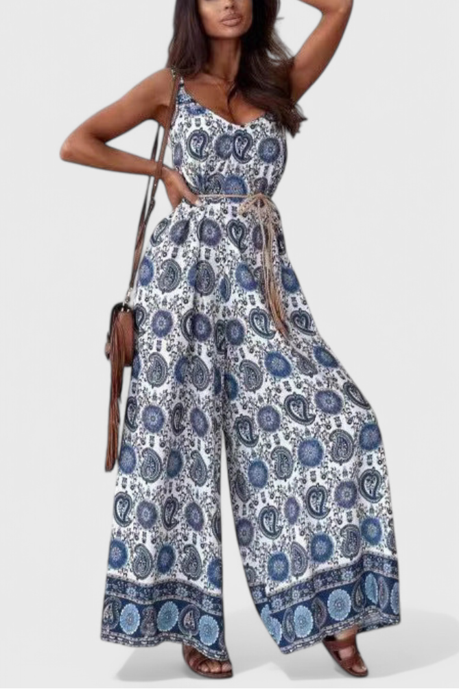 Faites une entrée remarquée avec Gabriella : un mono fluide à jambe large conçu pour attirer l'attention. Avec son décolleté en V flatteur, ses délics bretelles spaghetti et sa ceinture qui définit la taille, ce look allie un imprimé audacieux à une sophistication sans effort. Idéal pour des escapades ensoleillées ou des soirées élégantes.