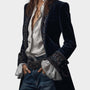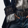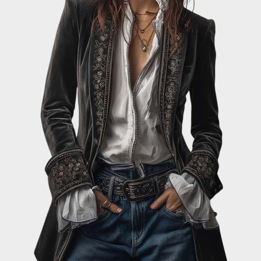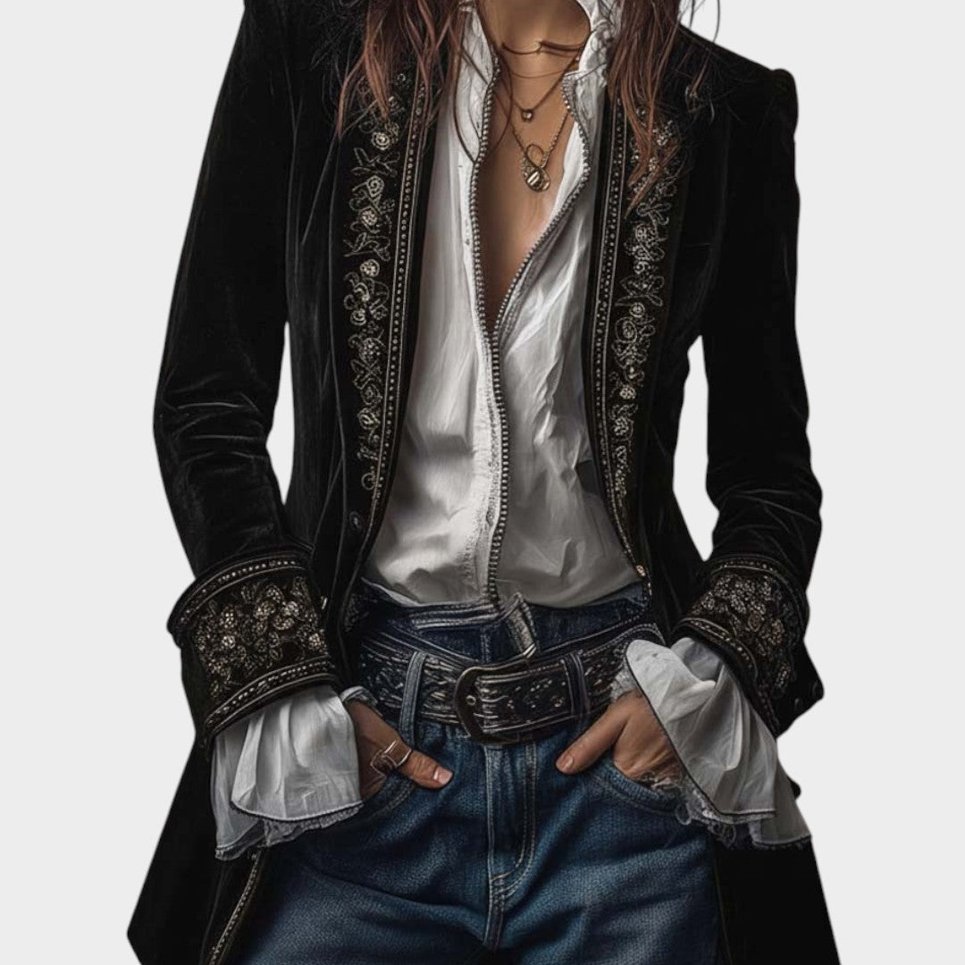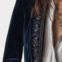 La veste Sara apporte une élégance sereine à votre garde-robe avec sa texture veloutée et ses délicats détails brodés.